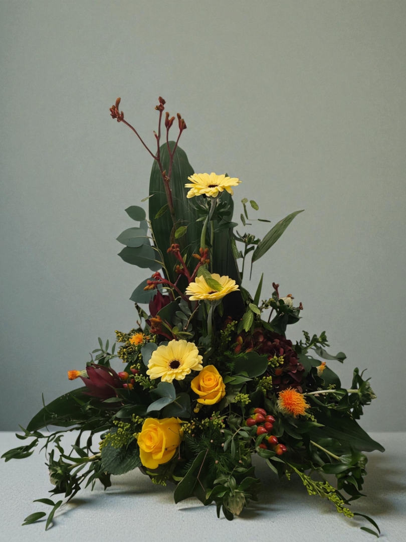 Aurelia is a graceful seasonal arrangement, rich in lush greenery and accented with just a few yellow and orange blooms for a subtle touch of warmth.
