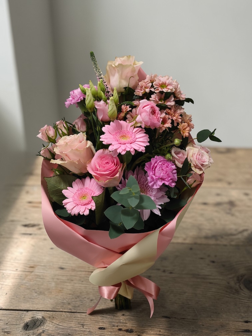 Includes: A mix of seasonal pink flowers, gift-wrapped for presentation