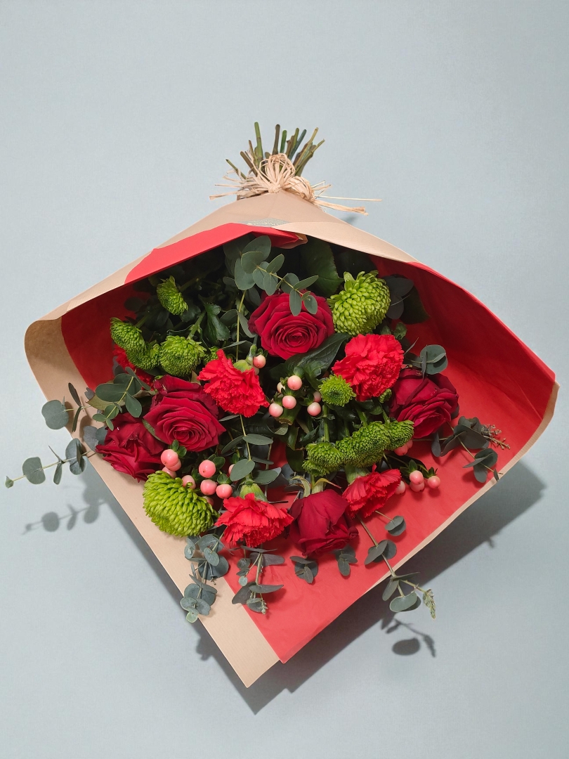 Bold and beautiful, this gift-wrapped bouquet features a rich combination of red and green flowers, perfectly balanced to create a dramatic and elegant statement. With vibrant red blooms (such as roses, gerberas, or carnations) paired with lush green foliage and seasonal accents, it’s a stunning choice for romantic gestures, festive occasions, or heartfelt celebrations.