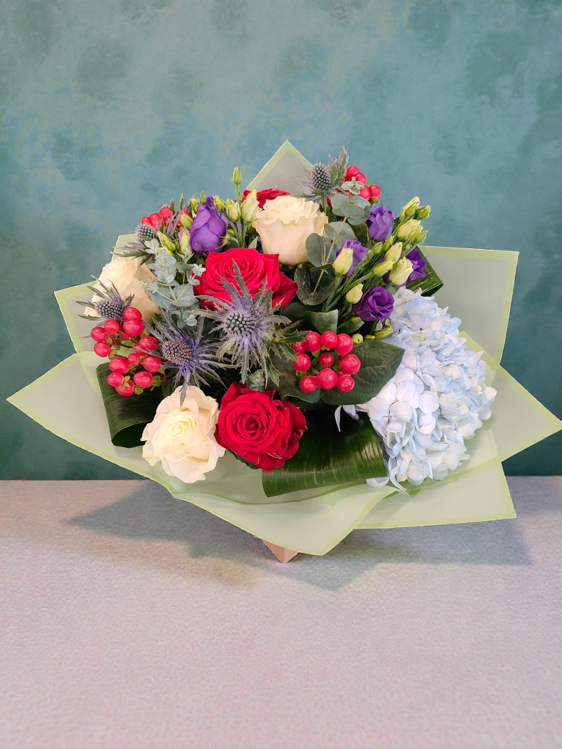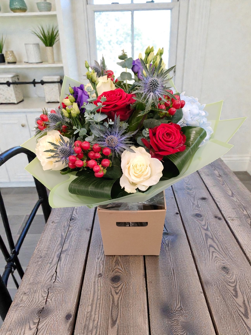 Opulent and regal, The Windsor Bouquet is a showstopping arrangement designed to impress. Featuring fresh flowers in rich jewel tones – including ruby red roses, amethyst lisianthus, diamond white roses, and lush forest green foliage – this bouquet radiates elegance and sophistication.