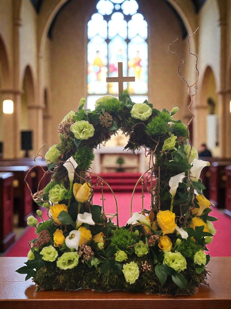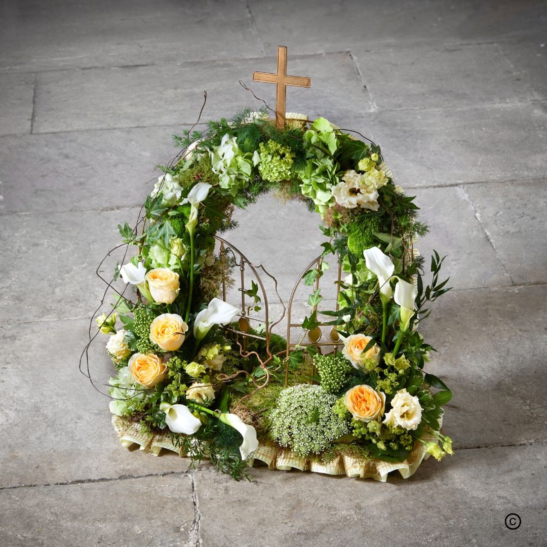 Our Gates of Heaven Tribute is a beautifully symbolic arrangement, thoughtfully designed by our florists. Crafted with a base of fresh foliage and delicate clusters of seasonal flowers, it features a central cross and open gates, representing peace, faith, and a final resting place. A deeply meaningful tribute to honour a loved one’s spiritual journey.