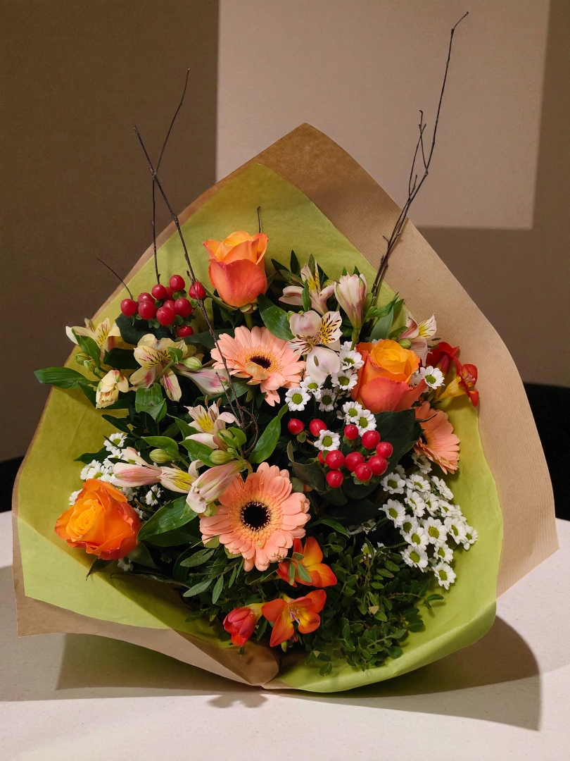 Presented in beautiful paper and ribbon, this bouquet arrives without a water source, ready to be placed in a vase upon delivery. Perfect for brightening a room or sending as a heartfelt seasonal gift, Autumn Ember is autumn’s energy, wrapped up just for you.