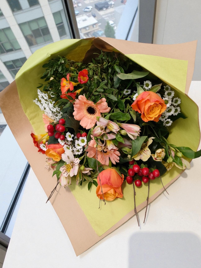 Bold and full of seasonal warmth, Harvest Drops celebrates the rich, glowing colours of fall. Vibrant golden yellows, fiery oranges, and earthy brown blooms are hand-tied with care and accented by fresh foliage for a striking, textured look.