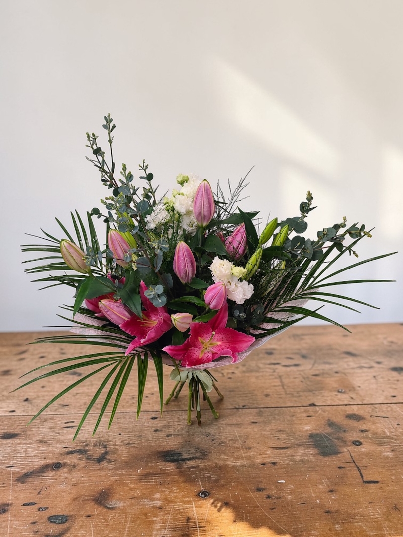 A graceful and elegant bouquet featuring all pink and white Lilies, delicate Lisianthus, and soft blending foliage. Hand-tied with care, this bouquet creates a harmonious display of gentle pink and white tones and lush texture.