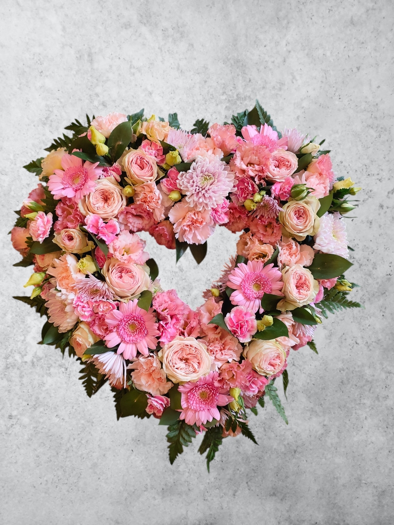 Pink Reverence is a tender heart-shaped tribute arranged in gentle shades of pink, symbolising admiration, love, and grace.