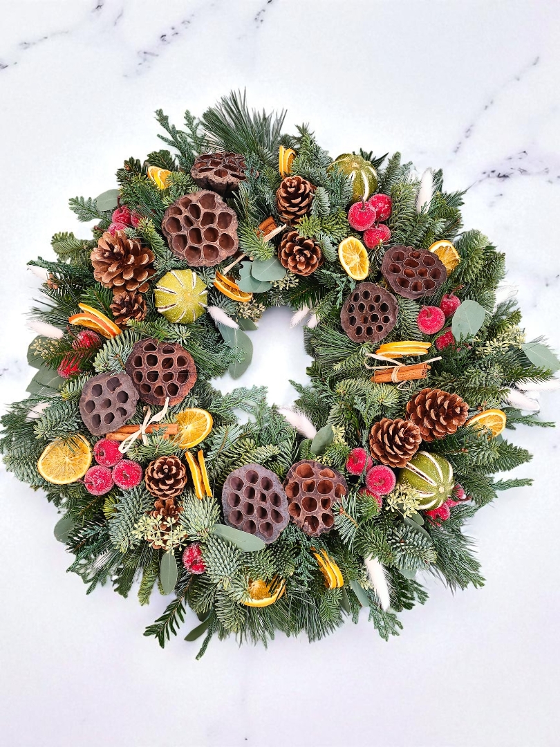 Bright, festive, and full of seasonal charm — our Golden Orchard Wreath celebrates the best of Christmas with a rich mix of dried oranges, cinnamon sticks, pinecones, lotus pods, and sparkling fruits. Handcrafted with lush evergreens and eucalyptus, this wreath brings warmth, texture, and a touch of luxury to your home.