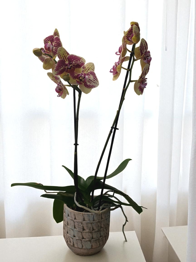 Graceful and long-lasting Phaleanopsis orchid plant presented in a stylish textured pot, it makes a perfect gift or a beautiful addition to any home or workspace. (please note colour of the orchid and style of the pot are subject to availability)