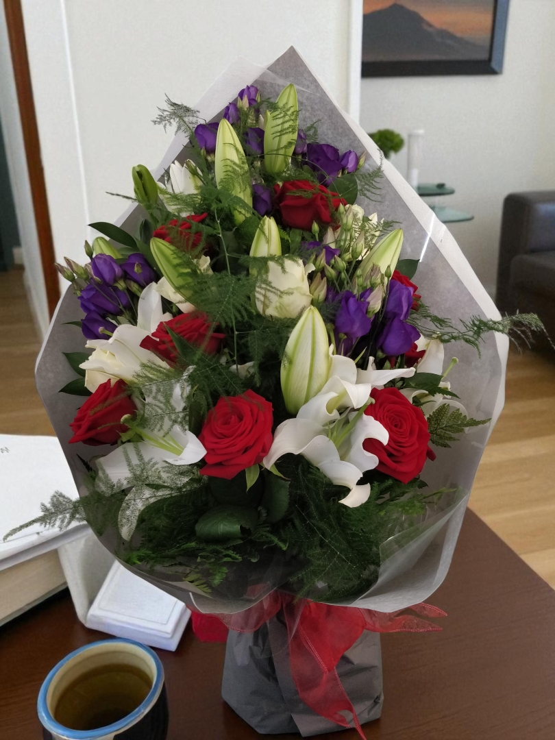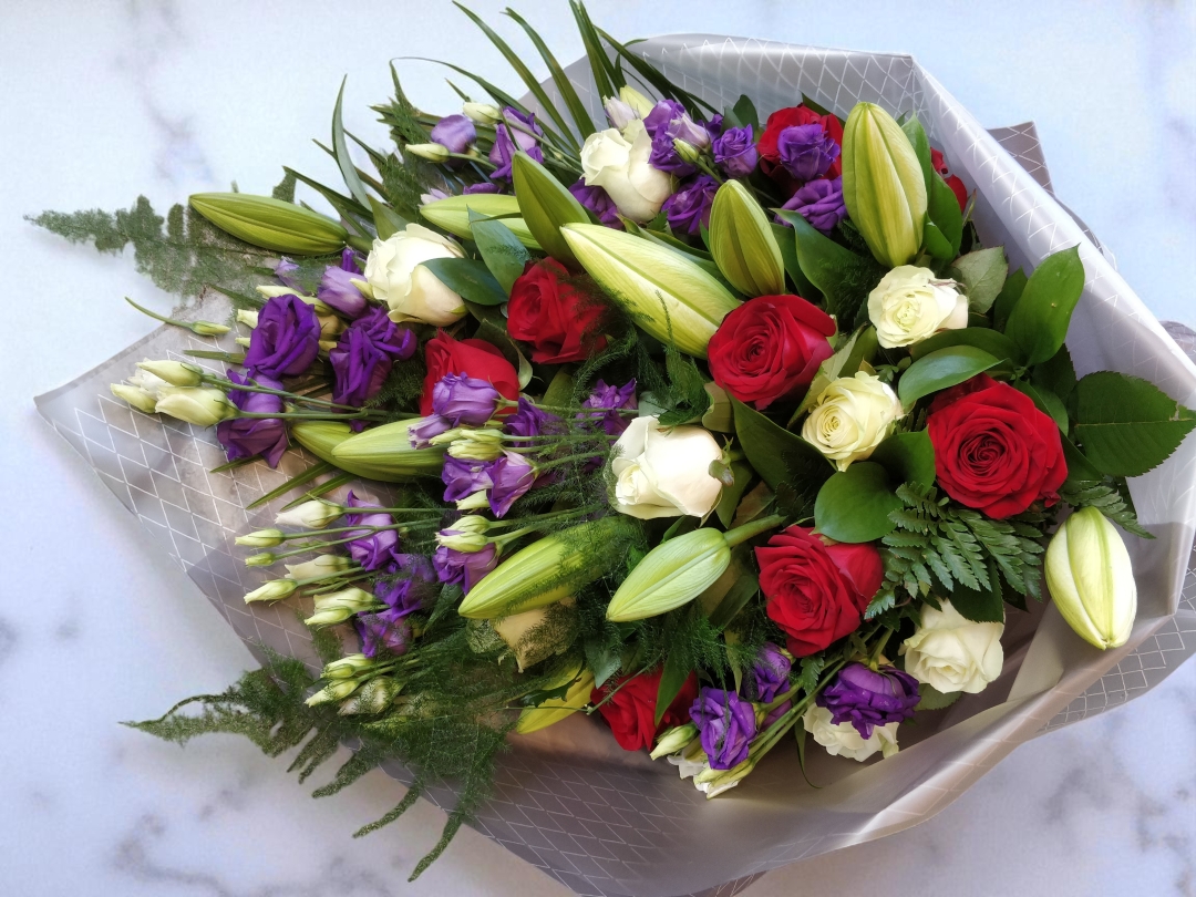 Crimson Harmony is a striking front-facing hand-tied bouquet that combines boldness with elegance. Vibrant red blooms symbolize love and respect, crisp white flowers add purity and serenity, and deep purple accents lend a touch of dignity and refinement. Expertly hand-tied, each bloom is arranged to create a harmonious and visually impactful display, ideal for placement against a wall or on a stand. This bouquet makes a heartfelt and memorable tribute, blending color, texture, and grace in perfect balance.
