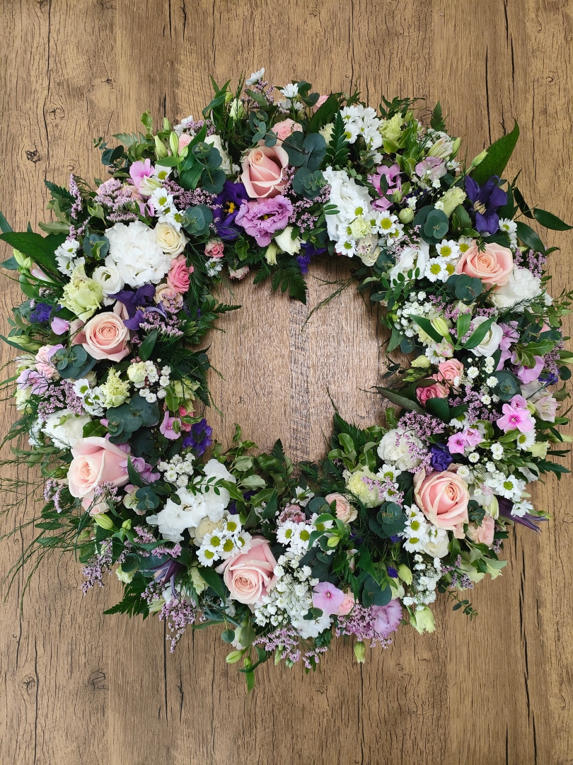 The Pastel Serenity Wreath is a delicate and elegant tribute, featuring a harmonious blend of soft white, gentle pink, and subtle purple blooms. Carefully arranged in a classic circular shape, this wreath conveys peace, love, and remembrance. Its soothing palette and graceful composition make it a tender and heartfelt way to honour a cherished life.