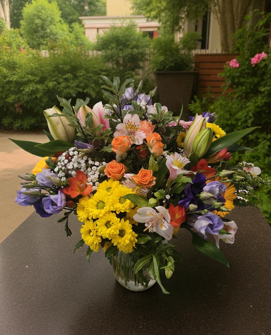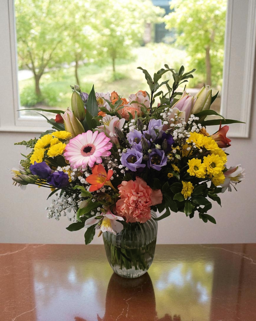 The Seasonal Splendour Vase Arrangement is a vibrant display of colourful seasonal flowers, artfully arranged in a stylish vase. Bursting with freshness and charm, this design celebrates the beauty of each season with a joyful mix of blooms and textures. Perfect as a gift or a bright addition to any home or workspace.