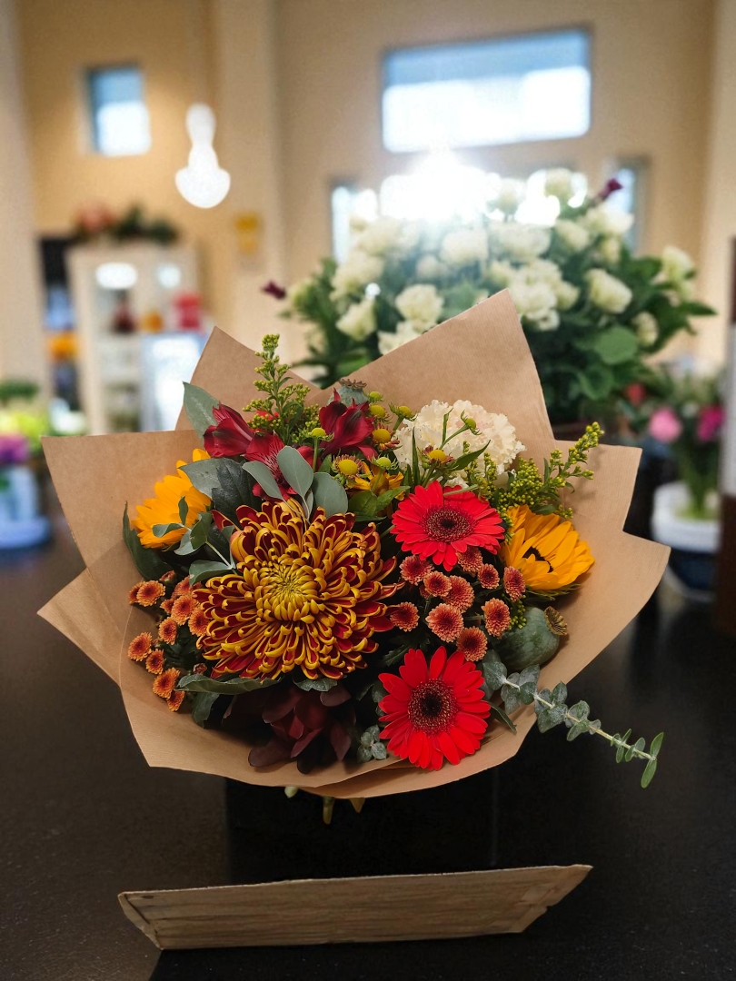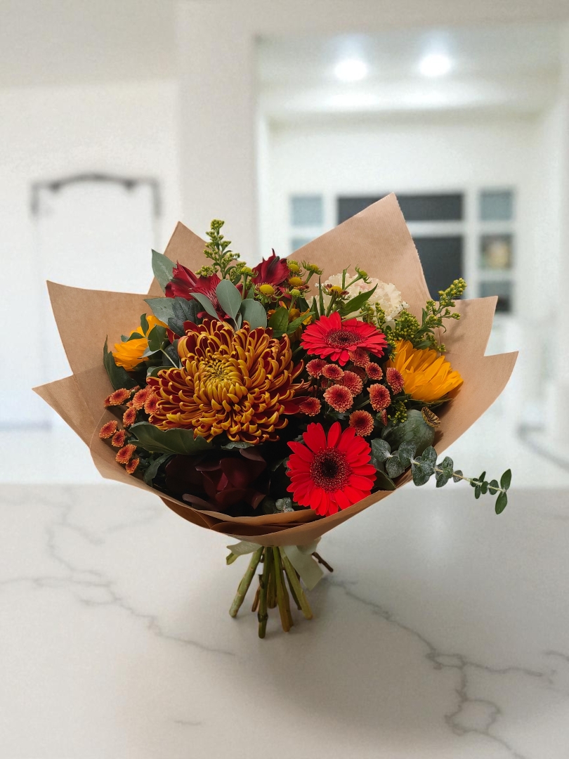 The Amber Fall Hand-Tied is a warm and seasonal bouquet, showcasing the rich colours of autumn. Featuring a harmonious blend of brown, red, and yellow blooms, this arrangement captures the beauty and texture of fall foliage. Ideal for gifting or bringing a cosy, seasonal touch to any home.