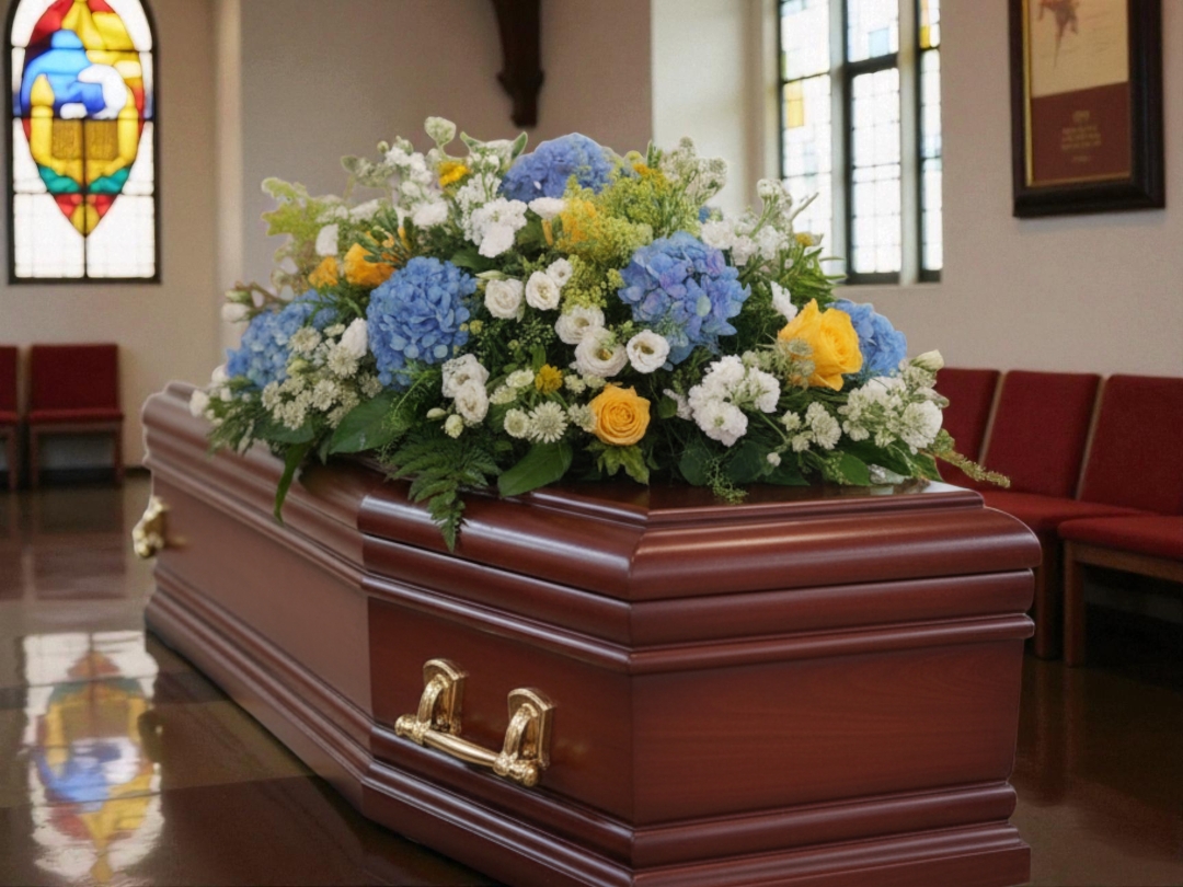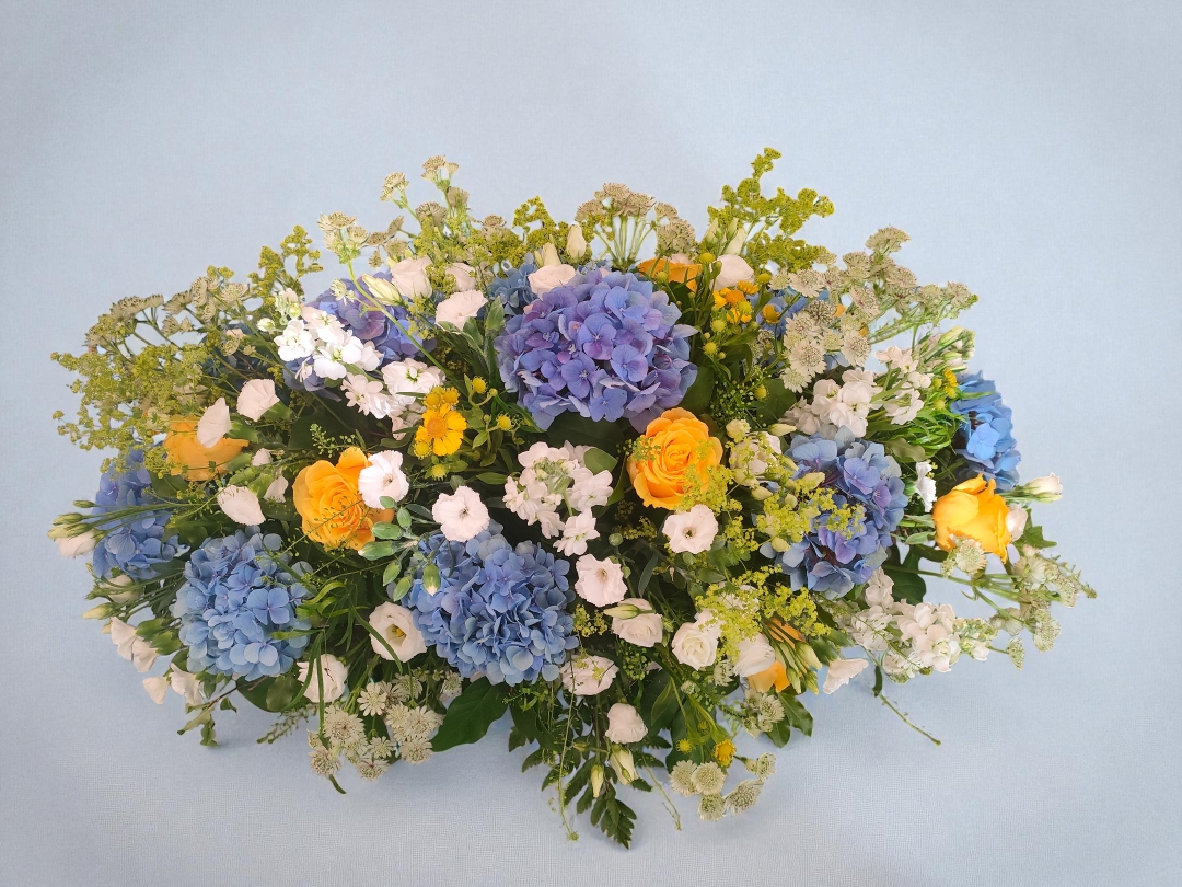 A serene casket spray featuring white and yellow blooms complemented by soft clusters of blue hydrangea. Heaven’s Harmony brings together purity, light, and calm — a gentle reflection of peace and remembrance. The blend of fresh whites, sunny yellows, and tranquil blues creates a soothing tribute filled with grace and heartfelt beauty. 🤍💛💙