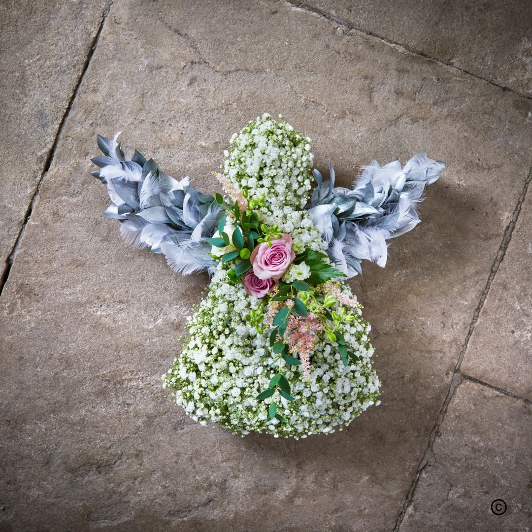 Angel’s Embrace is a delicate funeral tribute featuring soft white Gypsophila, a gentle rose cluster, and ethereal feathered wings. This graceful design evokes peace, purity, and protection, offering a heartfelt and serene way to honour a cherished life. 🤍✨