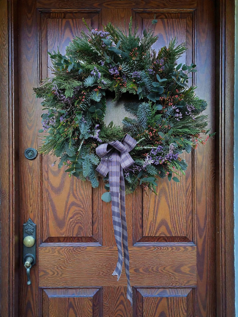 A festive Christmas door wreath decorated with rich red and purple accents and finished with a matching ribbon. Handcrafted with seasonal foliage and vibrant details, this wreath adds a bold and elegant touch to your front door throughout the festive season.
