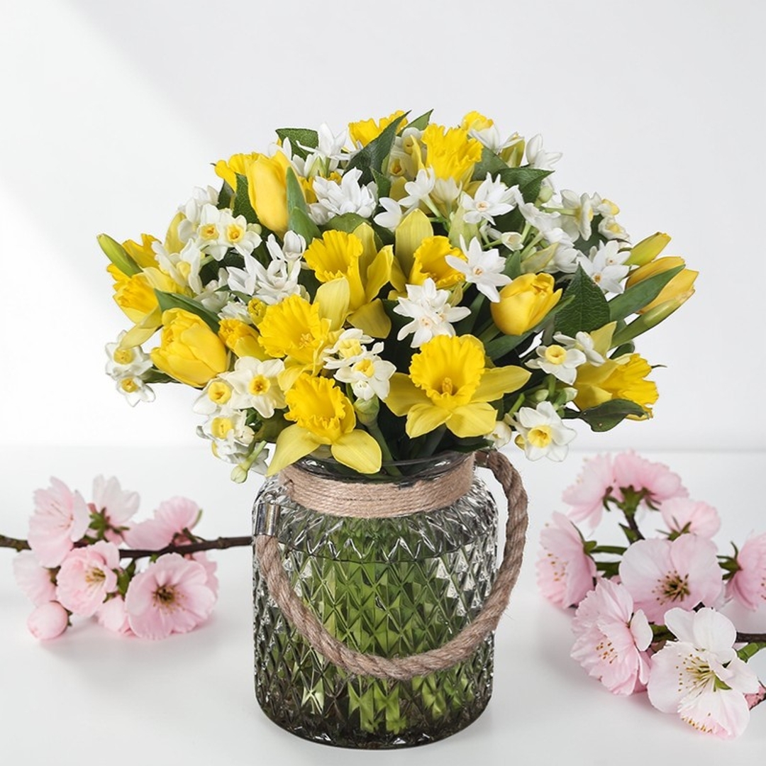 A bright and uplifting vase arrangement featuring fresh yellow daffodils paired with elegant white narcissi. Bursting with springtime freshness and seasonal charm, this bouquet is the perfect way to bring sunshine to Mum’s Mother’s Day. 💛🤍🌿